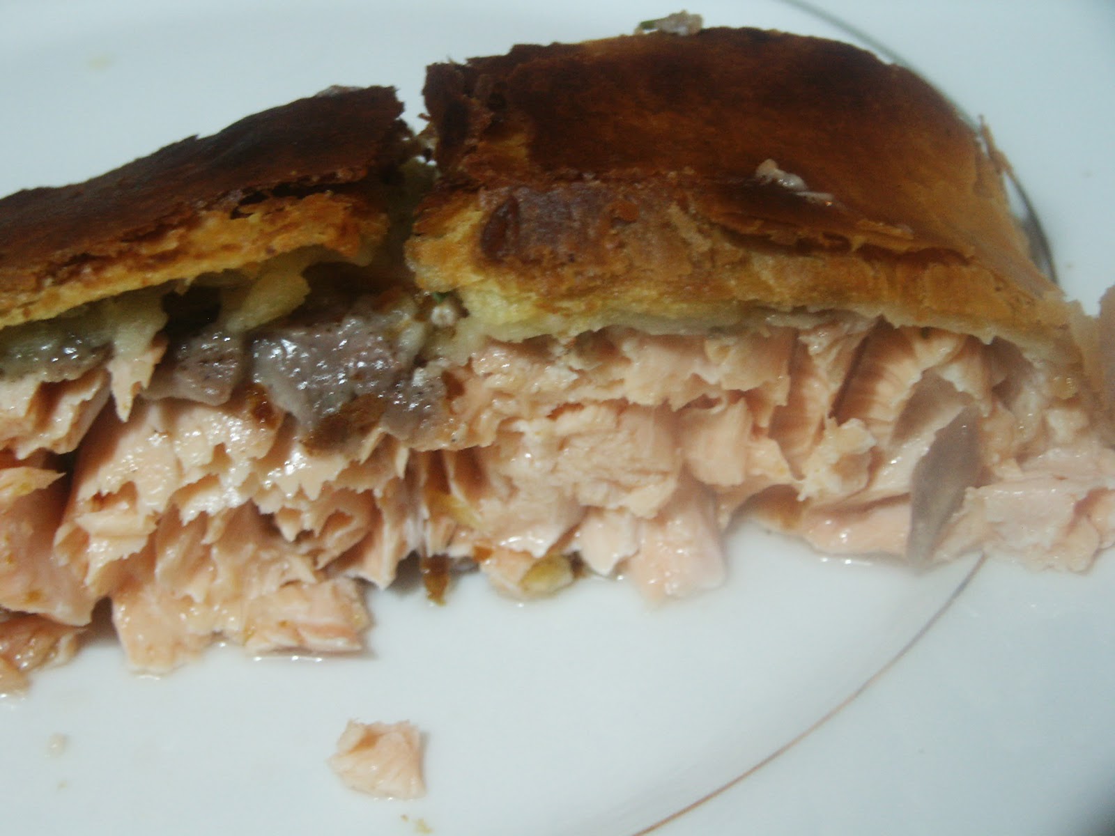 Ce saumon a une drôle d'histoire, je voulais du poisson pour noël, mais la famille avait envie d'une volaille, la majorité l'a emporté enfin pour noël car j'ai ressorti mon idée au 31, mais entre temps un virus a contaminé la famille sauf le mari, l'ingrat il a résisté.... Et donc lorsque j'ai parlé de mon idée malade à mon tour j'ai proposé un feuilletée en croûte de saumon. Evidemment la famille s'est moqué et m'a demandé la recette...Mais je leur ferai un jour un saumon fumé farci de pâte feuilletée rien que pour voir leur tête!!